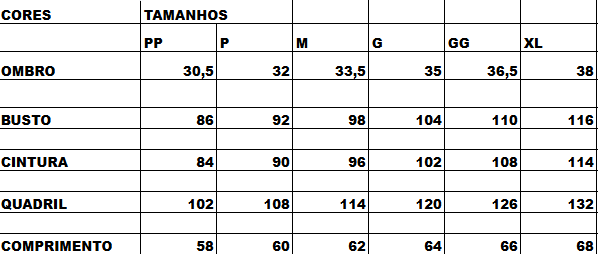 🔹 A modelagem é mais reta e confortável — as medidas de busto, cintura e quadril crescem de forma proporcional.