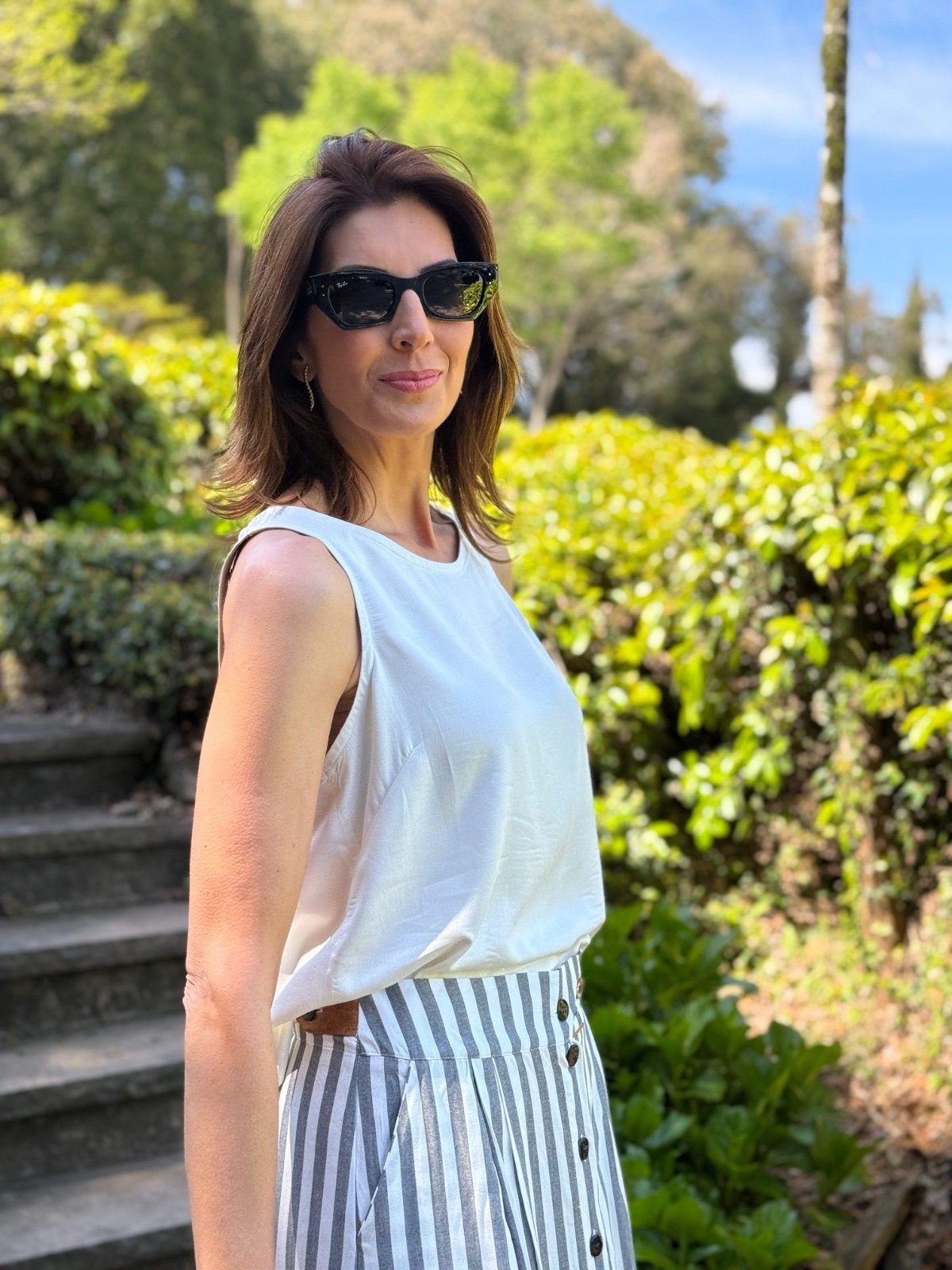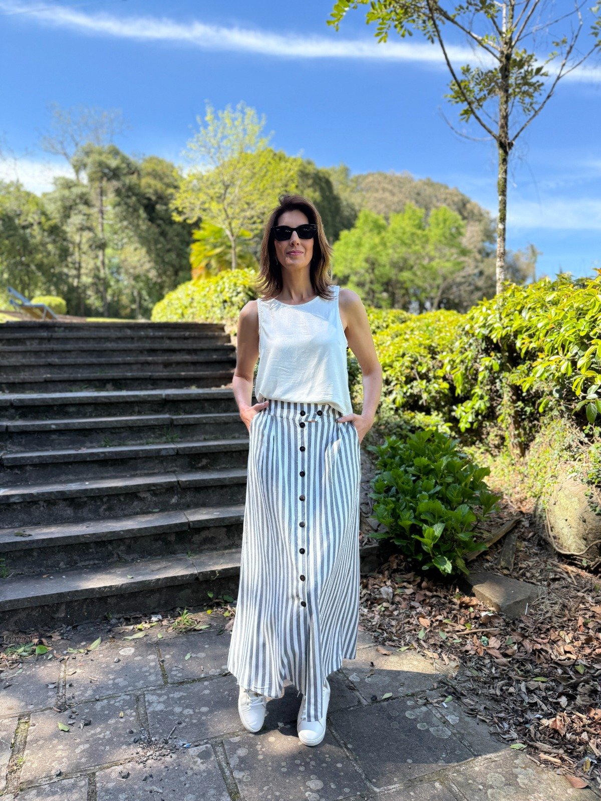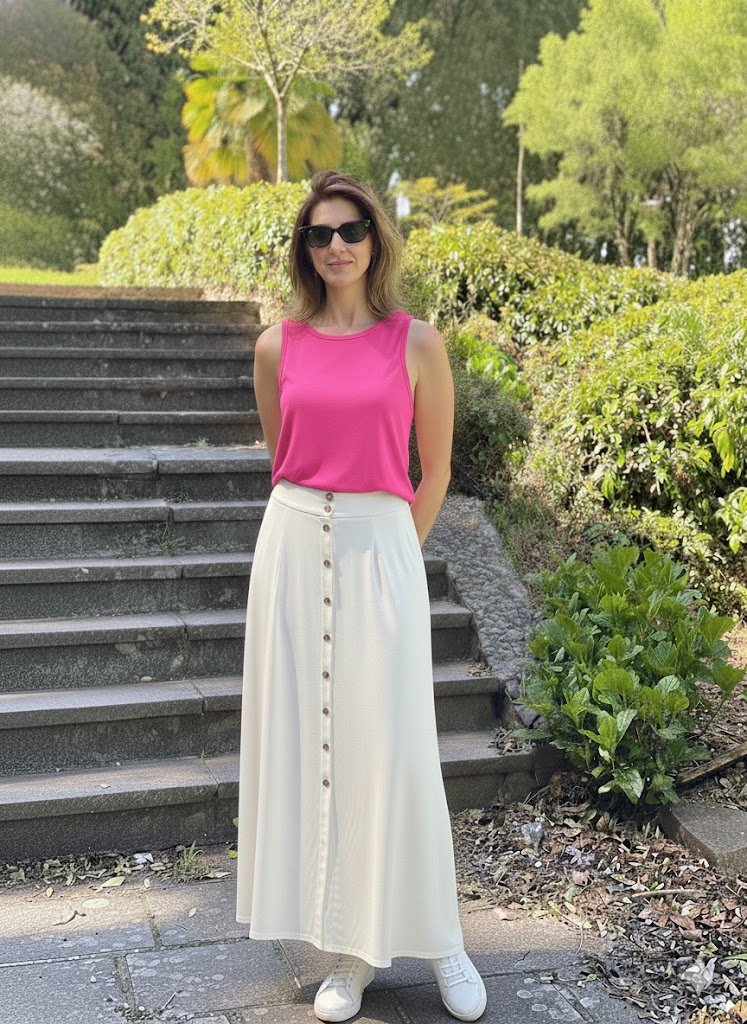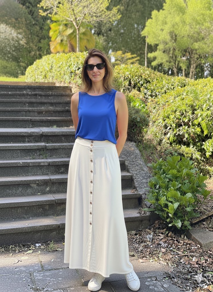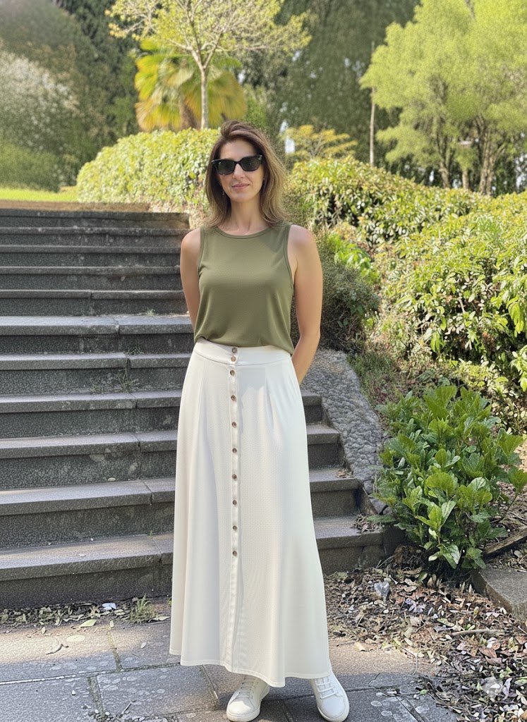 A Regata Celine traduz elegância em linhas simples. Desenvolvida em viscose plana, destaca-se pelo corte reto, pela barra larga que valoriza a silhueta e pelo pense de ajuste no busto, que garante um caimento perfeito. Sua fluidez e leveza tornam a peça indispensável para composições modernas e atemporais.