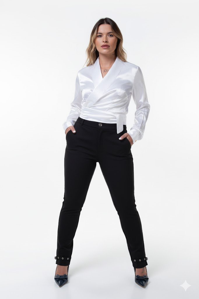 Corte solto de alfaiataria, bolsos frontais bolsos vivos estreitos traseiros com rolete e botões, cós e pregas frontais, elástico traseiro para ajuste, ziper invisível lateral, matingale de enfeite/ regulador cintura.