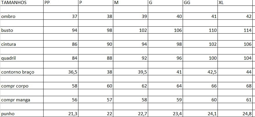 🔹 Meça a parte mais fina da sua cintura com uma fita métrica — sem apertar. 🔹 Compare com a tabela de medidas para identificar o tamanho ideal. 🔹 Exemplo: se sua cintura mede 96 cm, o tamanho PP (98 cm) é o mais indicado, pois já considera a folga da peça. 🔹 A modelagem é mais reta e confortável — as medidas de busto, cintura e quadril crescem de forma proporcional.