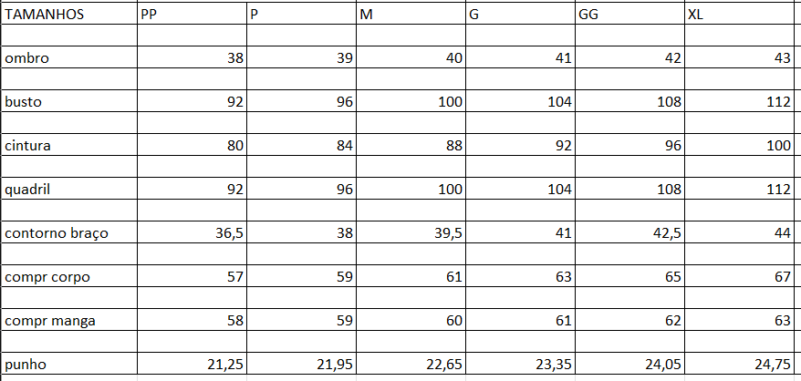 🔹 A modelagem é mais reta e confortável — as medidas de busto, cintura e quadril crescem de forma proporcional.