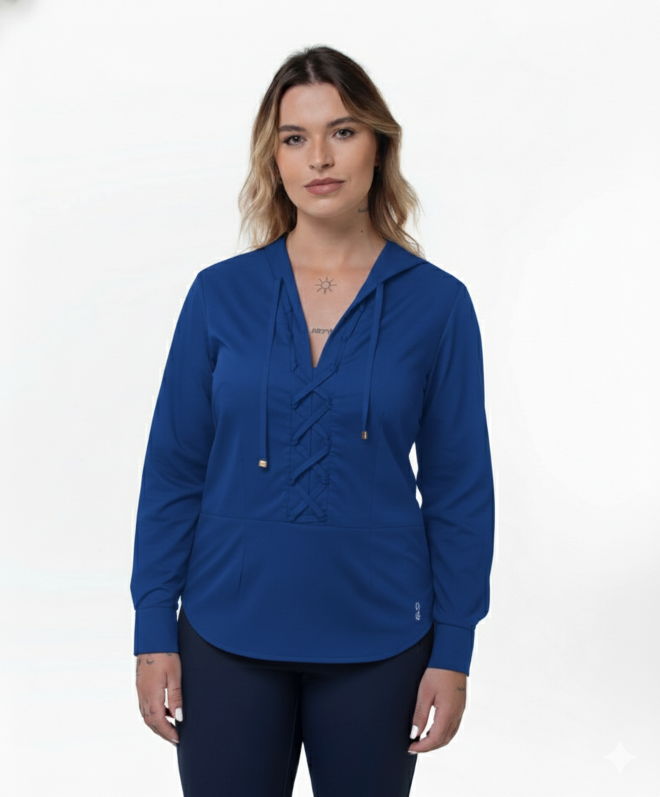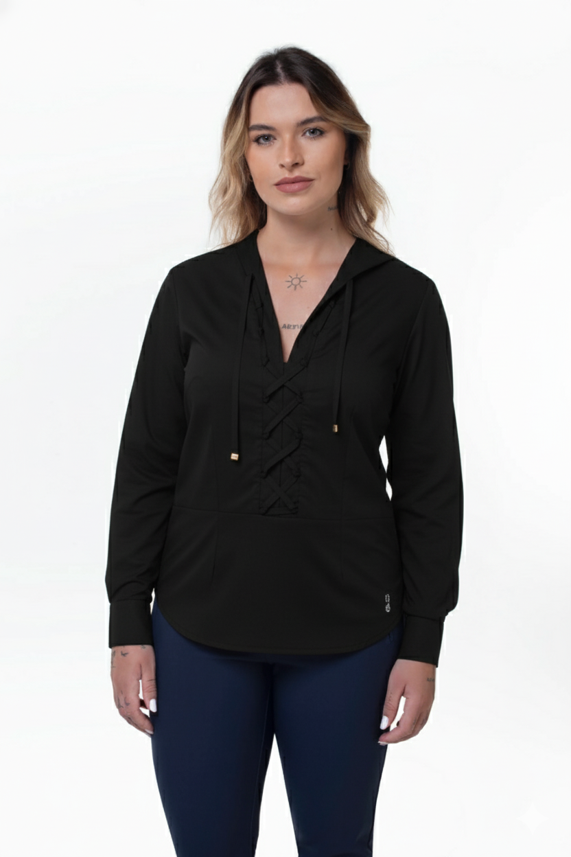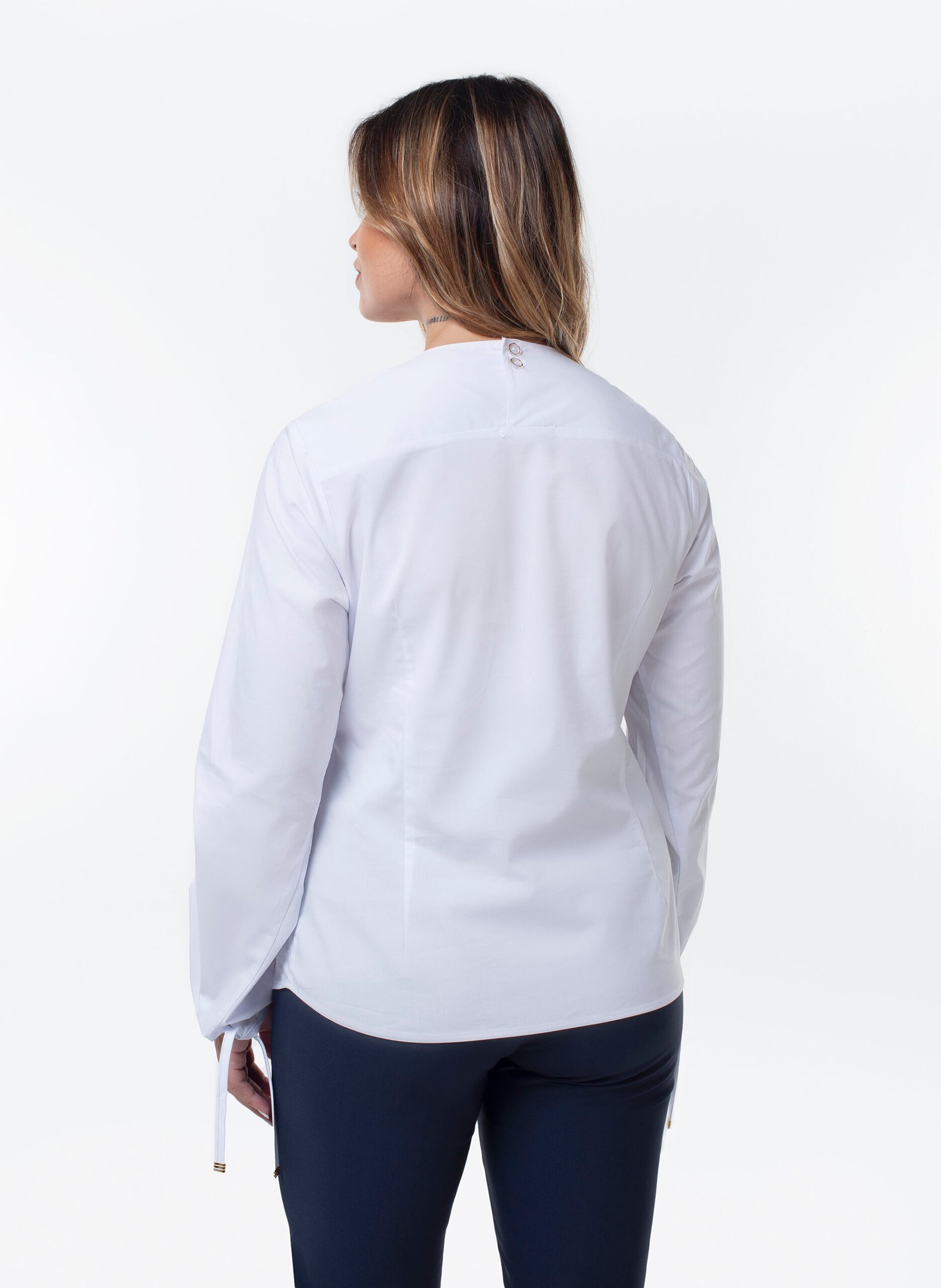 Camisa decote em V pala dupla frente e costas, manga longa com punhos carcela e ziper lateral embutido para ajuste no vestir, bordado de flor de linho na barra no tom da camisa.