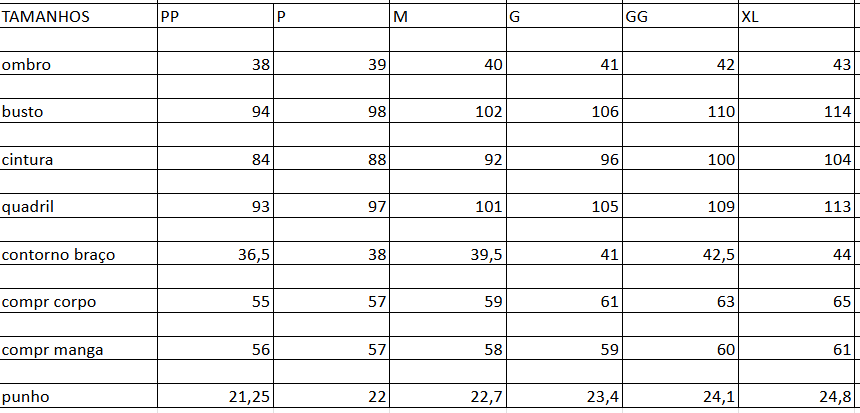 🔹 A modelagem é mais reta e confortável — as medidas de busto, cintura e quadril crescem de forma proporcional.