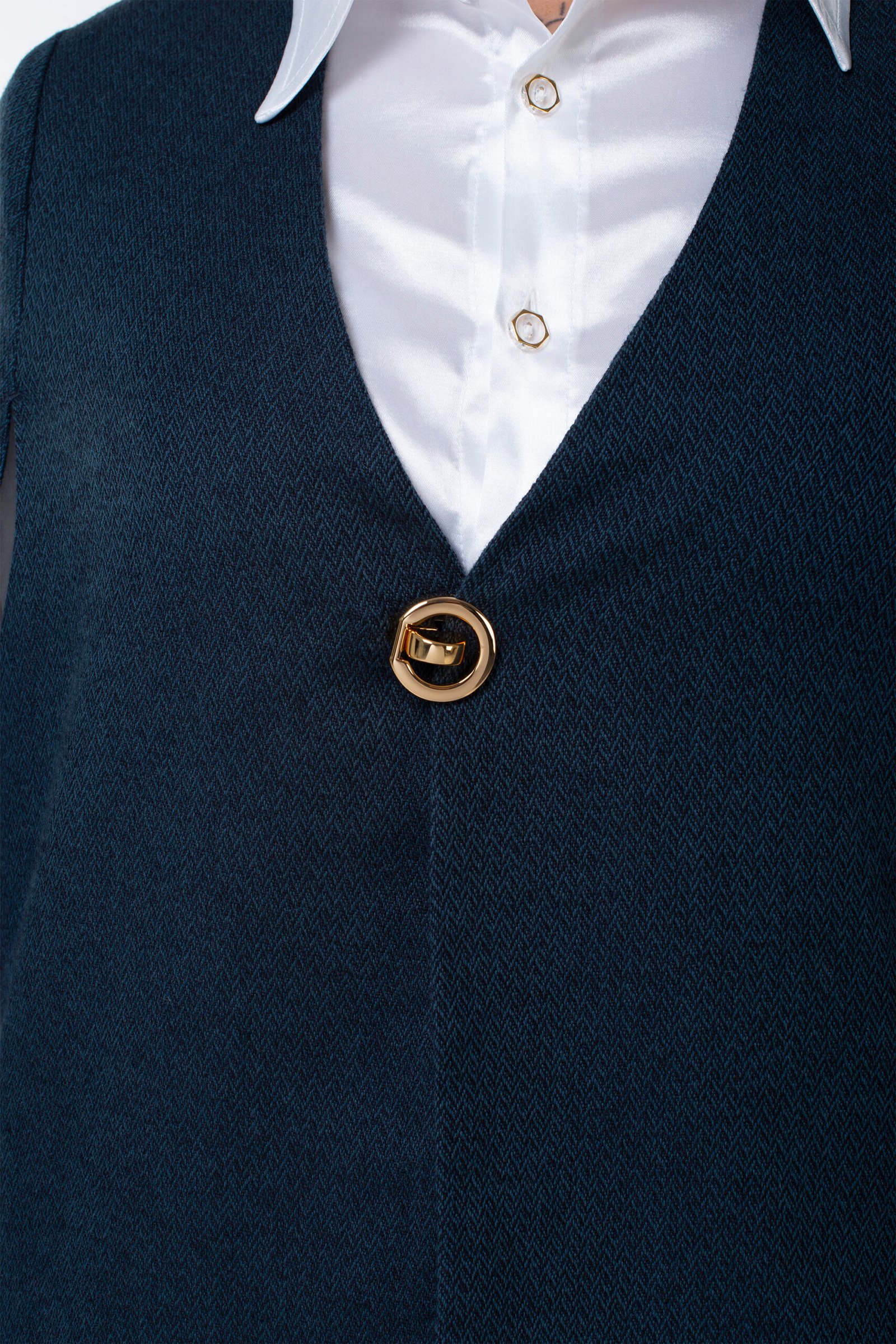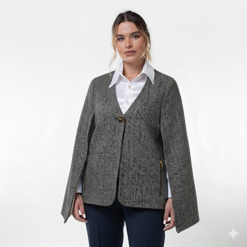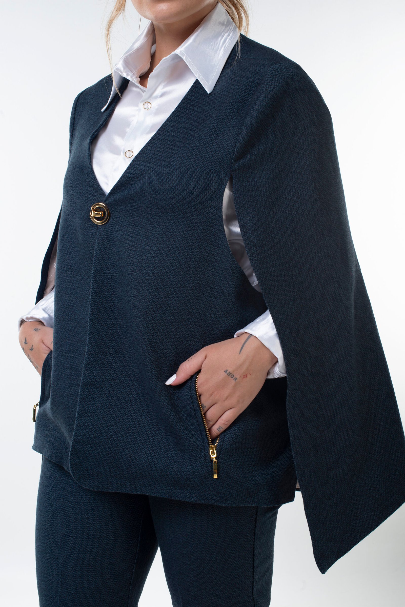 Modelo com grades de tamanho para ajustar ombros, bolsos com vivos estreitos e zipers com pingentes dourados, parte interna costas em forro duplo, fechamento especial com encaixe dourado.